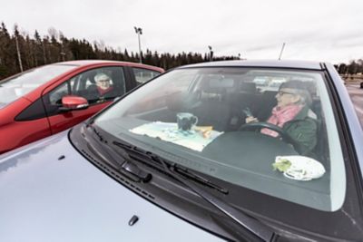 Naiset ovat olleet kaveruksia pikkutytöistä lähtien. Kun juttelemaan on kerran totuttu, yksi koronavirus ei tapaa tapa. Ratin takaa kuuluu vuoroin puhe, vuoroin nauru. Käsilläkin puhutaan sen verran rempseästi, että turvallisuussyistä virran on hyvä olla pois päältä.